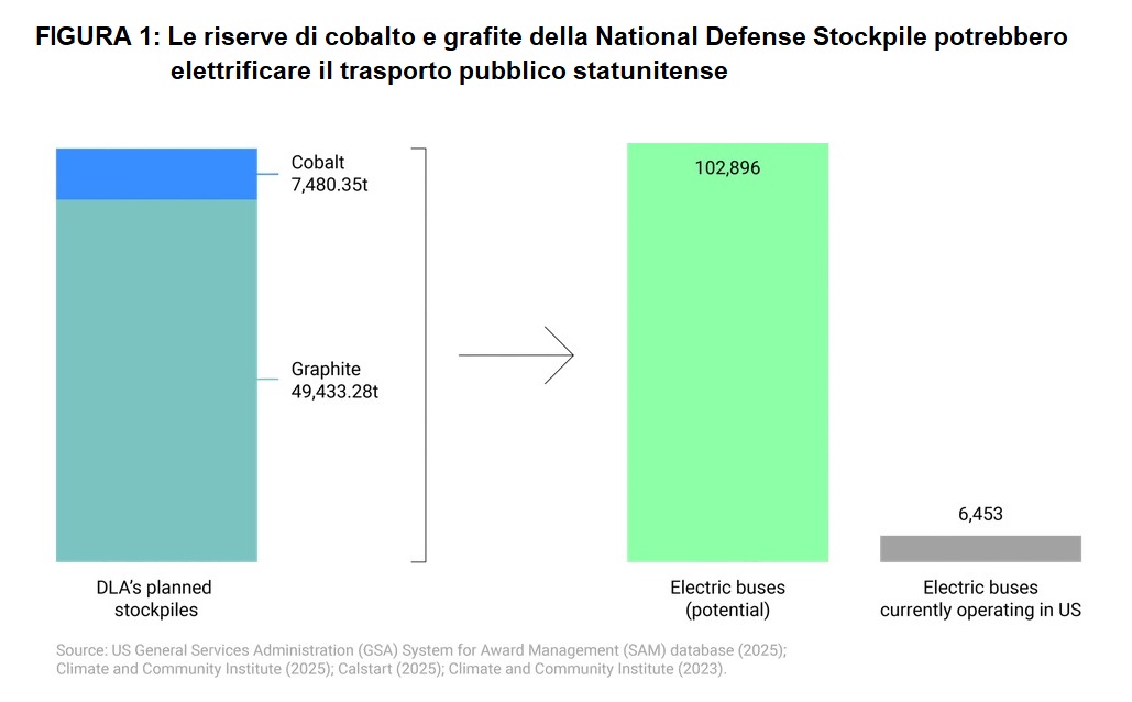 La quantità di cobalto e grafite che la DLA ha recentemente richiesto per la National Defense Stockpile potrebbe fornire il cobalto e la grafite necessarie per produrre oltre 100.000 autobus elettrici, una quota consistente della flotta necessaria per riordinare il sistema di trasporto degli Stati Uniti e per dare priorità al trasporto pubblico elettrificato rispetto alla dipendenza dalle auto. 37 Oggi, meno di 6.500 autobus elettrici sono in funzione a livello nazionale. 38