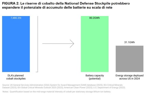 40. Secondo il Critical Minerals Dataset dell'IEA, nel 2024 sono state utilizzate 4.060,92 tonnellate di cobalto per l'accumulo nelle batterie della rete elettrica globale. Secondo il Global Critical Minerals Outlook dell'IEA, gli Stati Uniti rappresentano un quarto della domanda globale. Secondo il rapporto dell'US Energy Storage Monitor, nel 2024 negli Stati Uniti sono stati installati 37.143 GWh di sistemi di accumulo di energia. Quantificazione basata sull'intensità media del materiale di cobalto per batteria agli ioni di litio ad accumulo stazionario pubblicata dal Dipartimento per la valutazione dei materiali critici energetici degli Stati Uniti. Vedi: International Energy Agency, “Critical Minerals Dataset”, IEA maggio 2025. Kim, Buisson, Dasgupta, Dhir, Gagnon, Hegarty, Hwang, et al., “Global Critical Minerals Outlook 2025”, International Energy Agency. “REPORT: Energy Storage’s Meteoric Rise Breaks Another Record”, American Clean Power Association (ACP) and Wood Mackenzie, March 2025, available here; “Critical Materials Assessment”, U.S. Department of Energy, maggio 2023.