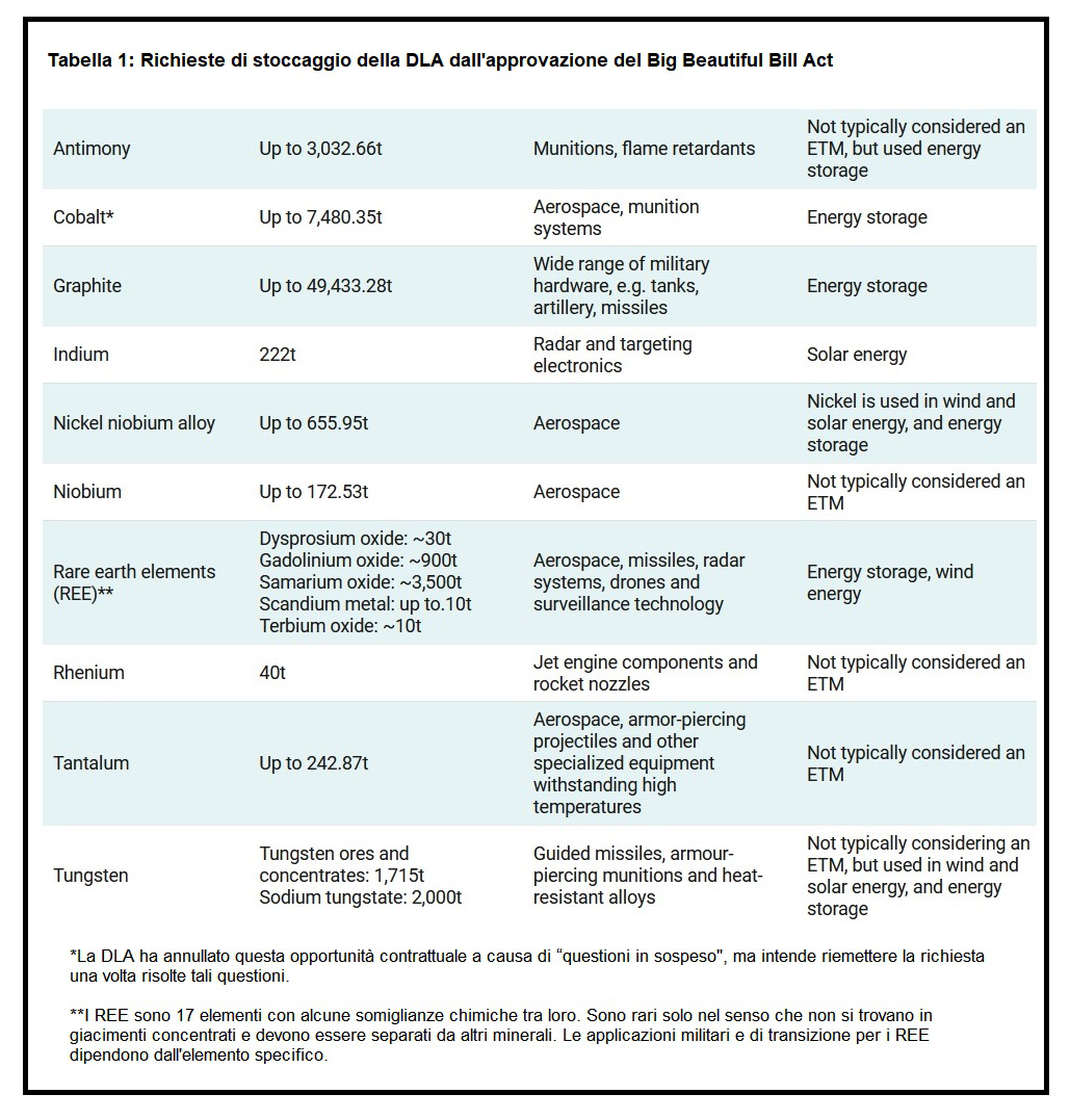 Nonostante queste limitazioni, l’analisi della recente attività della DLA dimostra le priorità emergenti nello stoccaggio di minerali dual use, evidenziando il ruolo dell’esercito statunitense nelle catene di approvvigionamento vitali per le tecnologie di transizione sia militare che energetica. La DLA immagazzina circa 48 minerali e leghe in sei depositi in tutti gli Stati Uniti. 32 Il Trump’s Big Beautiful Bill ha stanziato 7,5 miliardi di USD per i minerali critici, di cui due milioni di dollari appositamente per la National Defense Stockpile (NDS). 33 La tabella seguente 34 riporta i contratti e le richieste di stoccaggio della DLA dall'approvazione del disegno di legge.