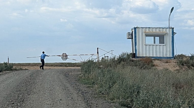 1) I posti di blocco presidiati dalle compagnie petrolifere limitano l'accesso alle sabbie bituminose di Kokzhide. Questo appartiene alla Ada Oil, controllata dalla Russia. Foto: Just Journalism, 18 agosto 2024.