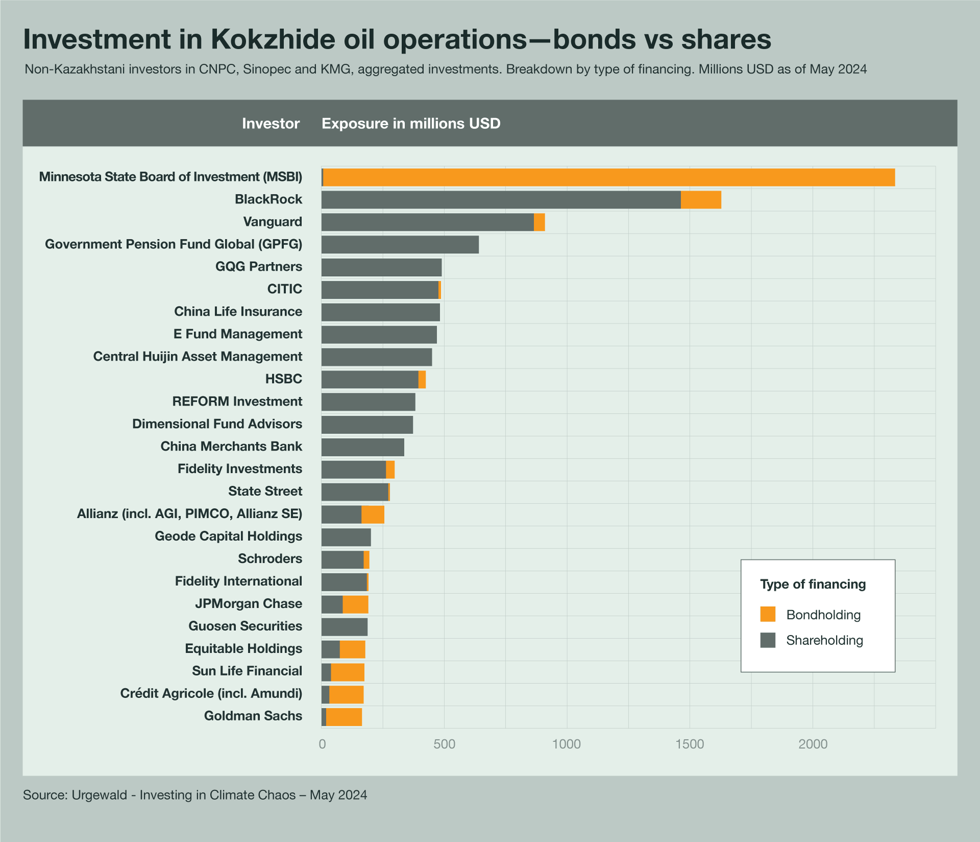 È interessante notare come il Minnesota State Board of Investment (MSBI) sia il principale investitore, con oltre 1 miliardo di dollari in obbligazioni di KazMunayGas e all’incirca la stessa somma nel gruppo petrolchimico cinese Sinopec. Il secondo maggiore investitore straniero in KazMunayGas detiene solo 114 milioni di dollari. Ciò pone l’MSBI in una posizione unica per interagire con il consiglio di amministrazione di KazMunayGas e spingere per la protezione delle preziose risorse idriche e della biosfera di Kokzhide.