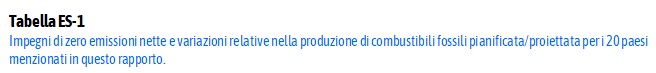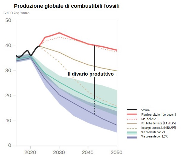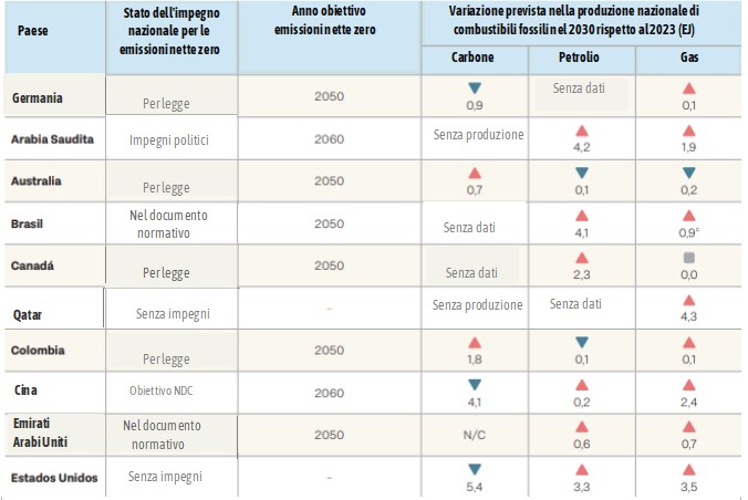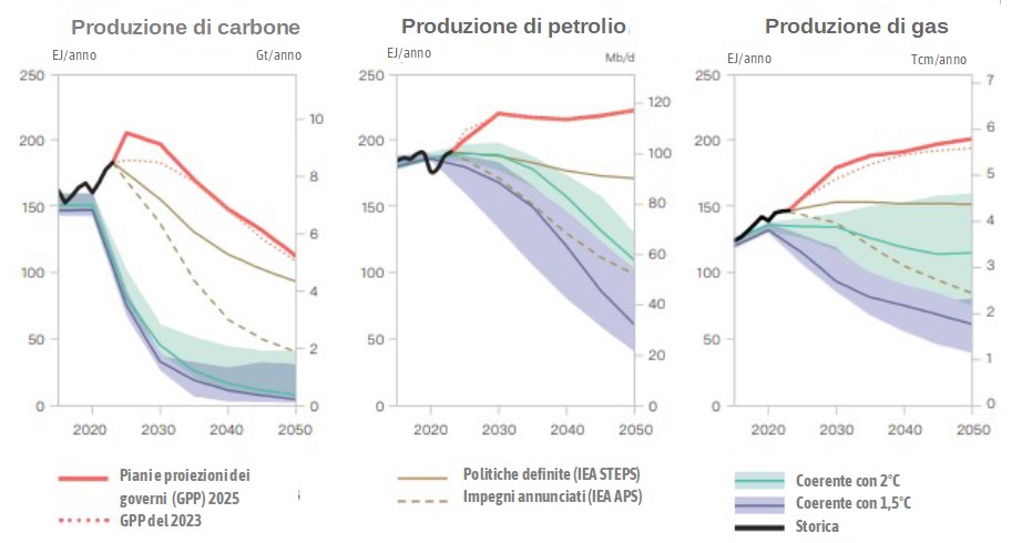 In sintesi i governi prevedono, rispetto alla produzione del 2023, livelli ancora più elevati di produzione di carbone entro il 2035 e di gas entro il 2050. La produzione pianificata di petrolio continua ad aumentare fino al 2050. Questi piani minano gli impegni dei paesi nell'ambito dell'Accordo di Parigi e contraddicono le aspettative secondo cui, con le politiche attuali, la domanda mondiale di carbone, petrolio e gas raggiungerà il picco prima del 2030.