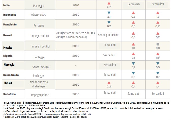 Come indicato nella tabella ES-1, 17 dei 20 paesi citati continuano a programmare un aumento della produzione di almeno un combustibile fossile fino al 2030; 13 tra i paesi citati prevedono aumenti significativi nella produzione di gas. Inoltre, come indicato nei profili dei paesi nel capitolo 3, si prevede che 11 paesi aumenteranno nel 2030 la produzione di almeno un combustibile rispetto a quanto previsto nel 2023, quando è stata effettuata l'ultima valutazione.